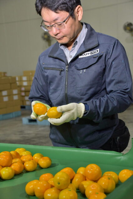 検査は、県やJAなどの関係者が立ち合い、農林水産省の植物防疫検査官が箱詰めされたミカンから、無作為に選んだ段ボールを開け、果実の表面を観察し、病害虫や小さな傷などが無いかを入念に確認した。