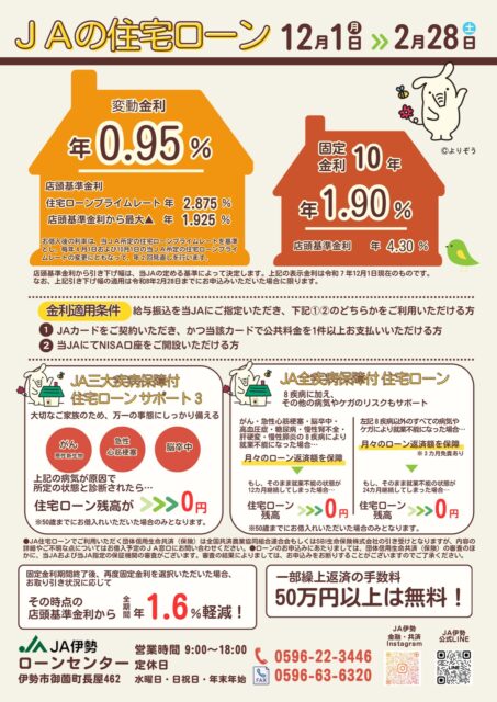 - ローンをご利用いただける方は、各JA所定の資格・要件を満たす方に限らせていただきます。なお、融資条件は各JAによって異なる可能性がございます。詳しくは窓口までお問い合わせください。