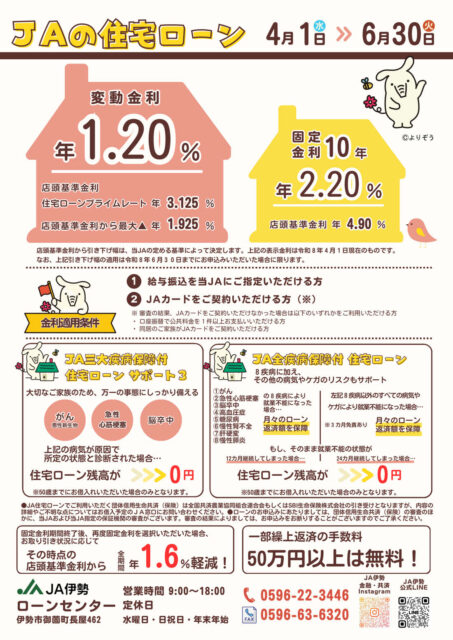 - ローンをご利用いただける方は、各JA所定の資格・要件を満たす方に限らせていただきます。なお、融資条件は各JAによって異なる可能性がございます。詳しくは窓口までお問い合わせください。
