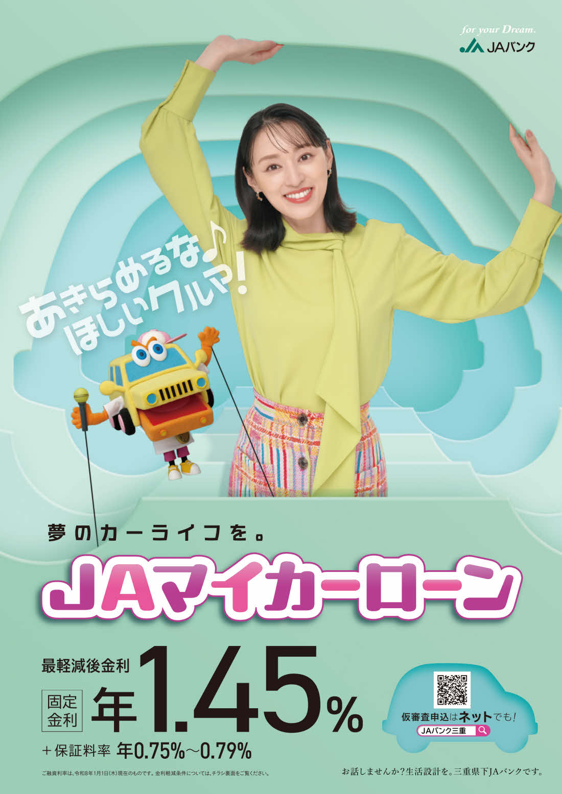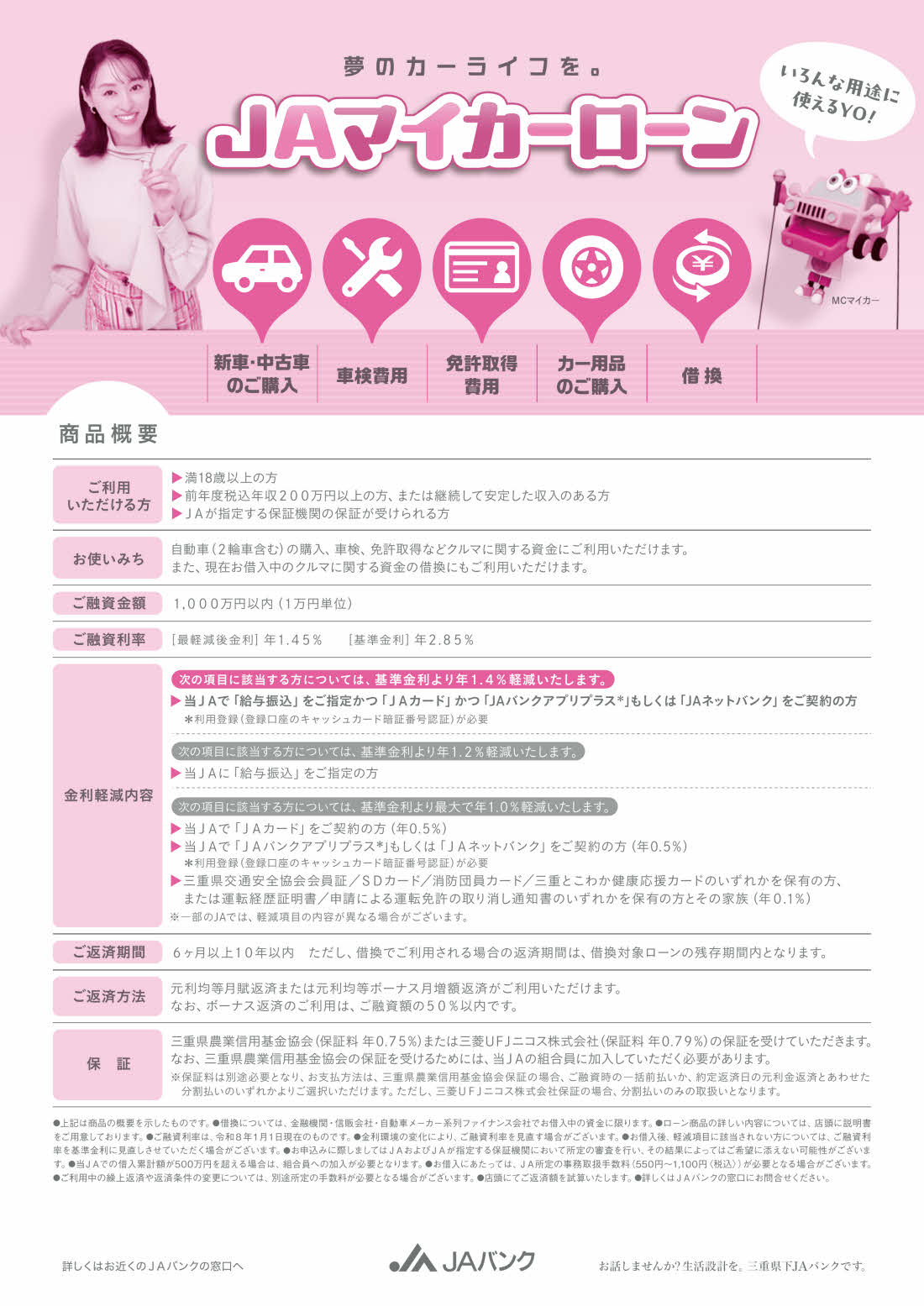 JAのマイカーローンは、新車や中古車の購入をはじめ、修理・免許取得費用など、カーライフに関する様々な用途にご利用いただけます。