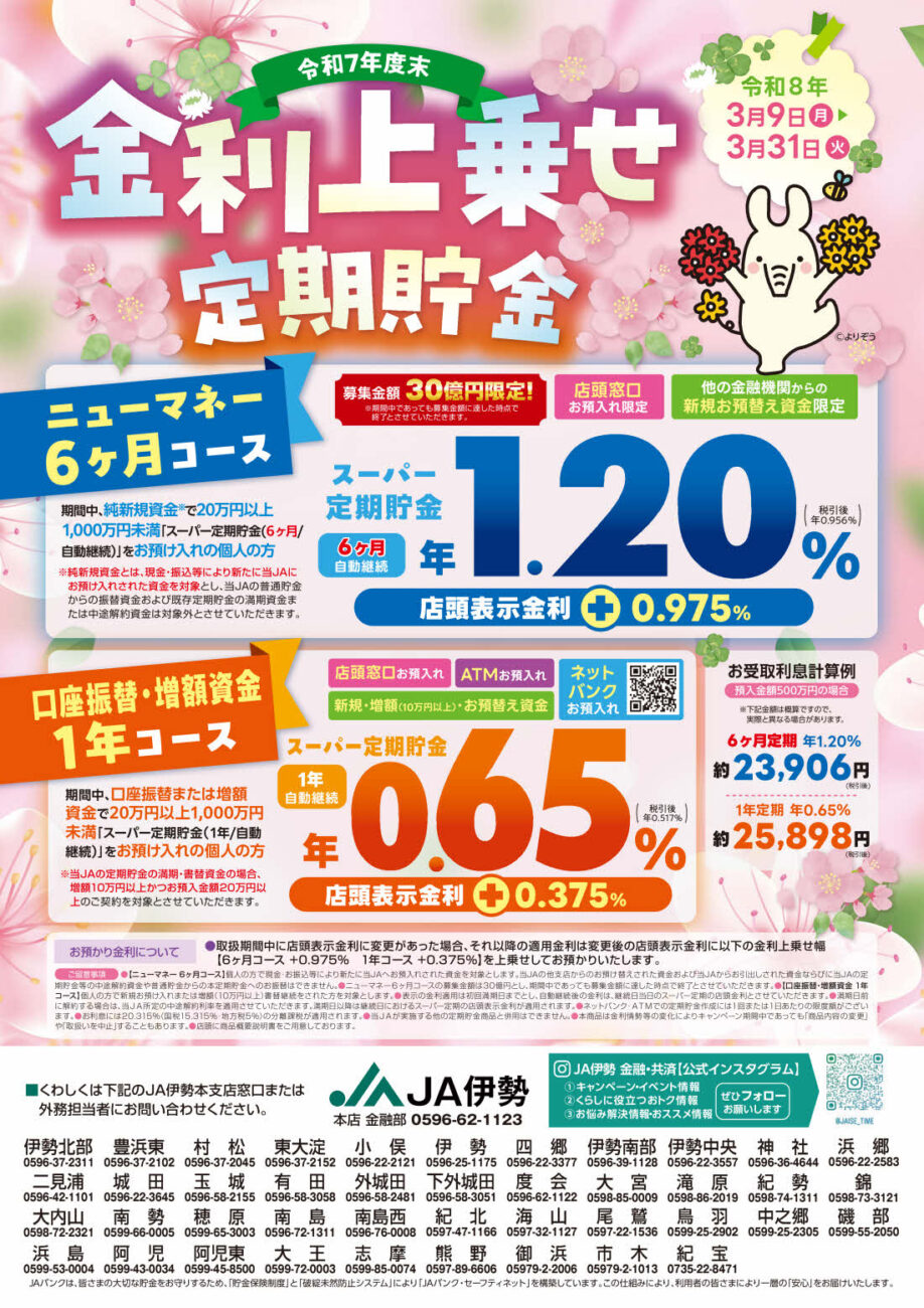 令和8年3月9日(月)から令和8年度金利上乗せ定期貯金の取扱いを開始します。