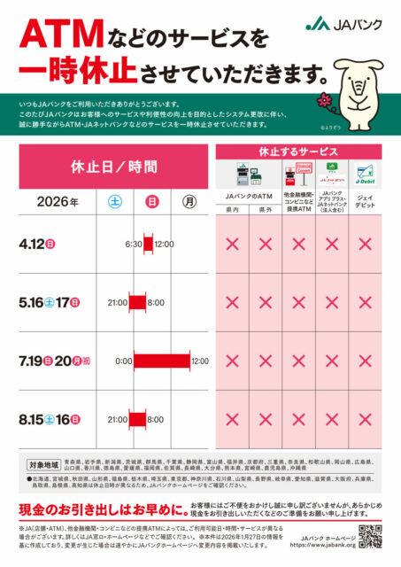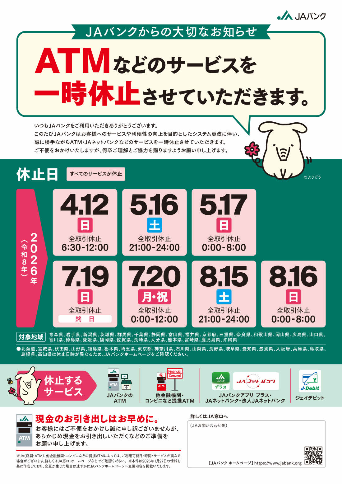 日頃はJAバンクをご利用いただき、ありがとうございます。 お客さまへのサービスや利便性の向上を目的としたシステム更改に伴い、誠に勝手ながらATM・JAネットバンク等のサービスを一時休止させていただきます。
