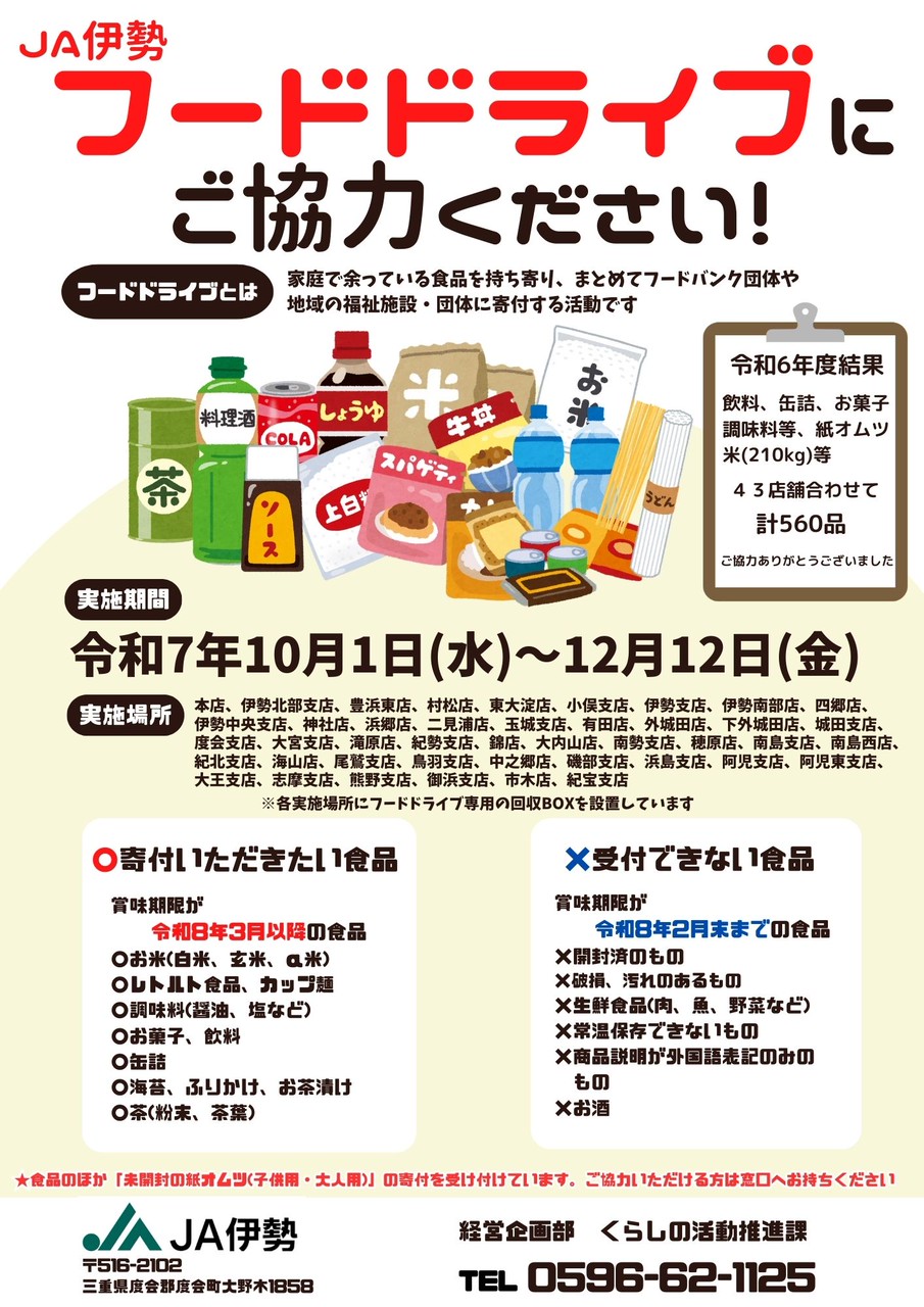 10月1日(水)から、JA伊勢の本店・支店で『フードドライブ』を実施します。