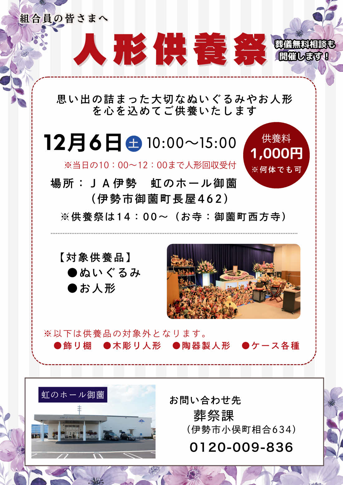 毎年ご好評をいただいている「人形供養祭」も敷地内の虹のホール御薗で開催いたします。