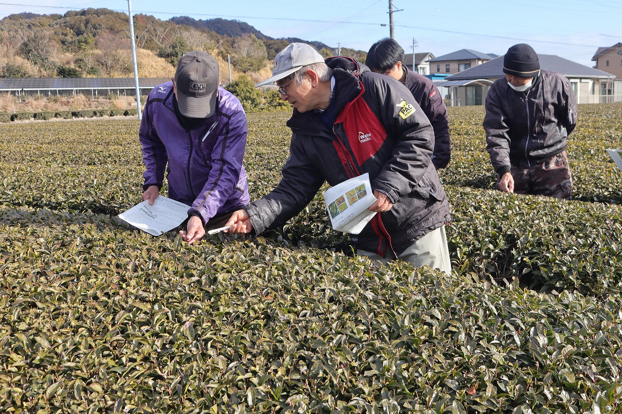 当日は同JA担当者から施肥管理や生育状況、凍霜害対策について説明があったほか、茶園を回りながら病害虫の発生量や防除適期などを確認した。