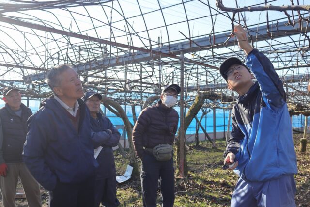 当日は、三重県中央農業改良普及センターの職員が、実演を交えながら手順や方法を説明。今年の剪定の注意点や側枝の扱い方などの確認を行った。