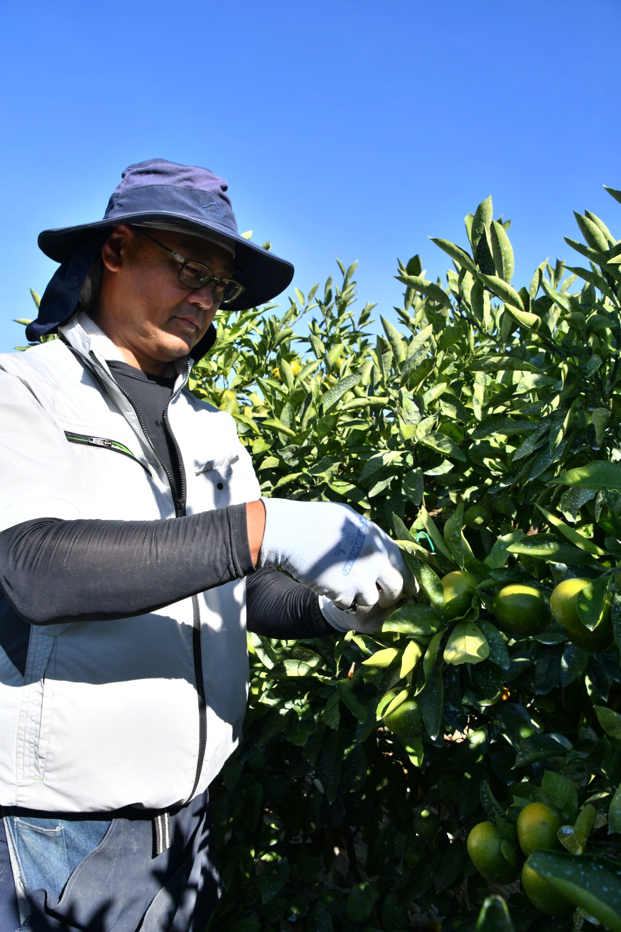 2024年に同町に移住し、今年初めての収穫を迎える多々納康志さん(54)の園地では、6日早朝から「味一号」を収穫するハサミの音が響く。ミカンを傷つけないよう注意しながら、一度目は手早くヘタから離れた場所を切り、もう一度ヘタに沿って切る「二度切り」で収穫する。同産地では出荷までの工程でミカン同士がぶつかり合っても傷がつかないよう「二度切り」を徹底する。