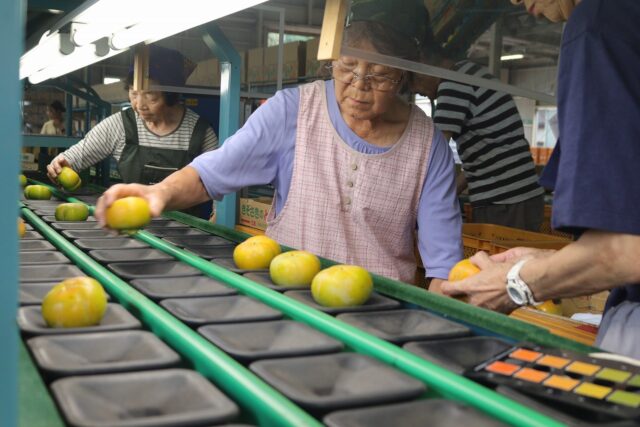 24日には、出荷に向けた目ぞろえ会を行い、部会員のほか同JAや全農みえの職員、市場関係者ら37名が選果の規格を確認。26日の初出荷では、選果担当者が蓮台寺柿を1つずつ手に取り、形や傷の有無を確認した後、大きさ別に箱詰めして出荷した。