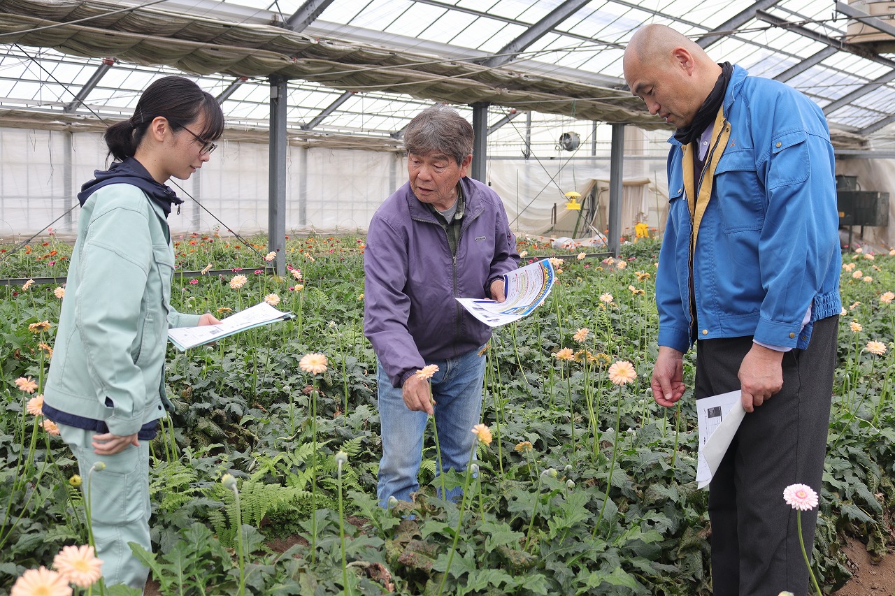 JA伊勢は18日、同JA洋花部会の部会員5名のハウスを巡回した。4月から5月にかけての改植に向けて、土壌診断の結果をもとに土づくりについて確認することで収量と品質の向上を図ることが目的。