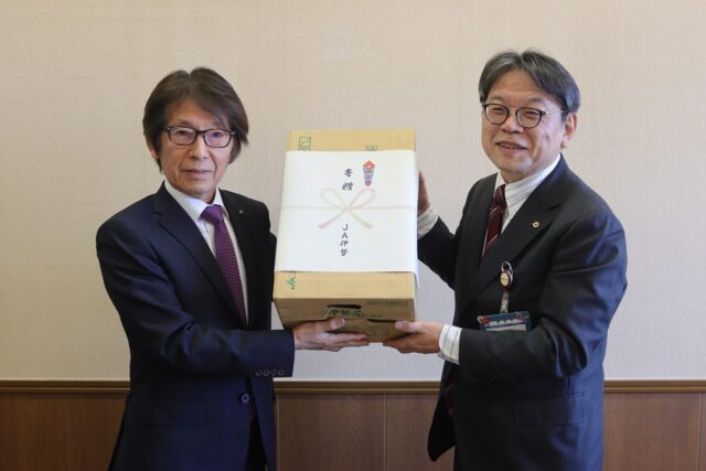 1月9日、JA伊勢の酒徳雅明代表理事組合長は度会町教育委員会を訪問し、2月15日に開かれる「第19回美(うま)し国三重市町対抗駅伝」に出場する選手団を激励するため、中村武弘教育長に飲料を寄贈した。